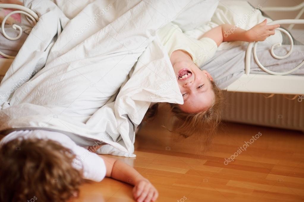 Kinder Jungen Und Madchen Auf Dem Bett Im Schlafzimmer Zu