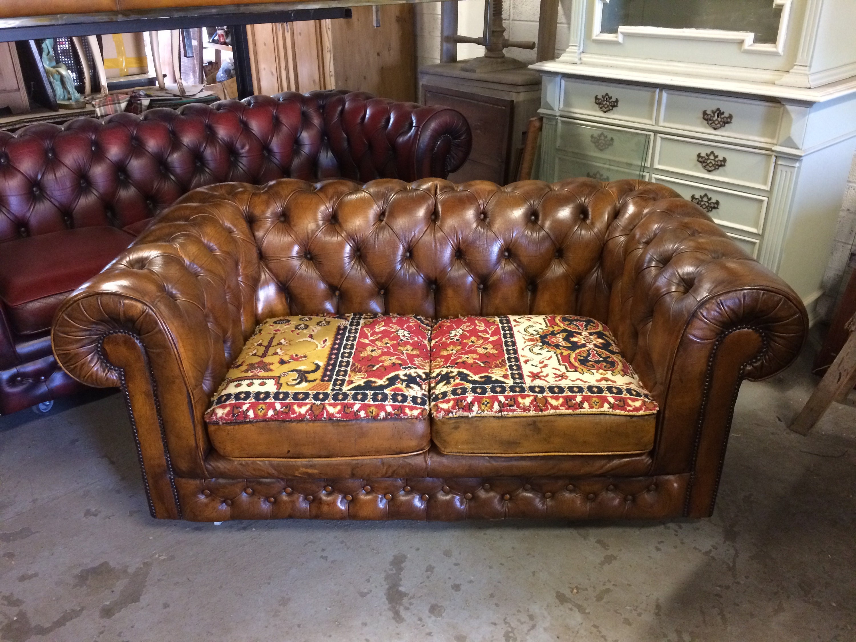Vintage Brown Tan Leather 2 Seat Chesterfield Sofa Country House With Carpet Cushions