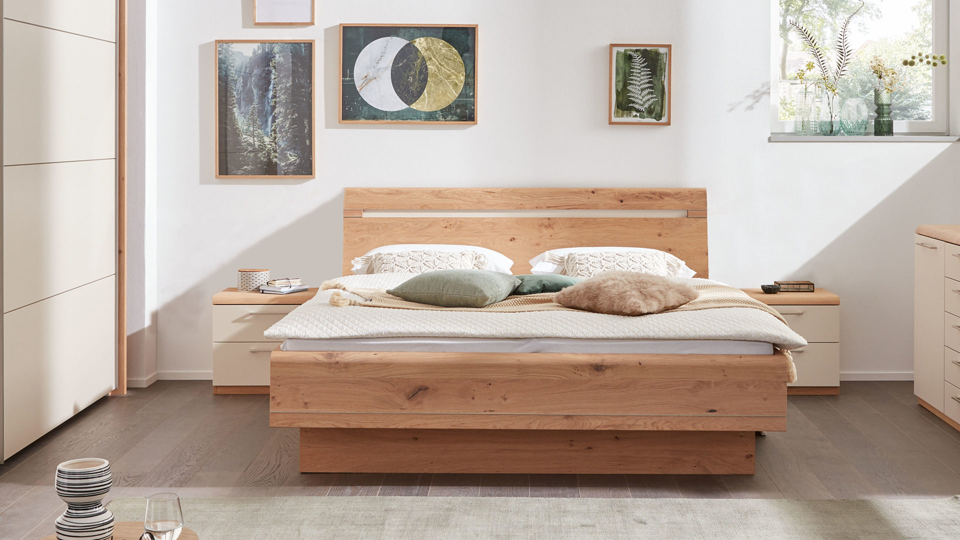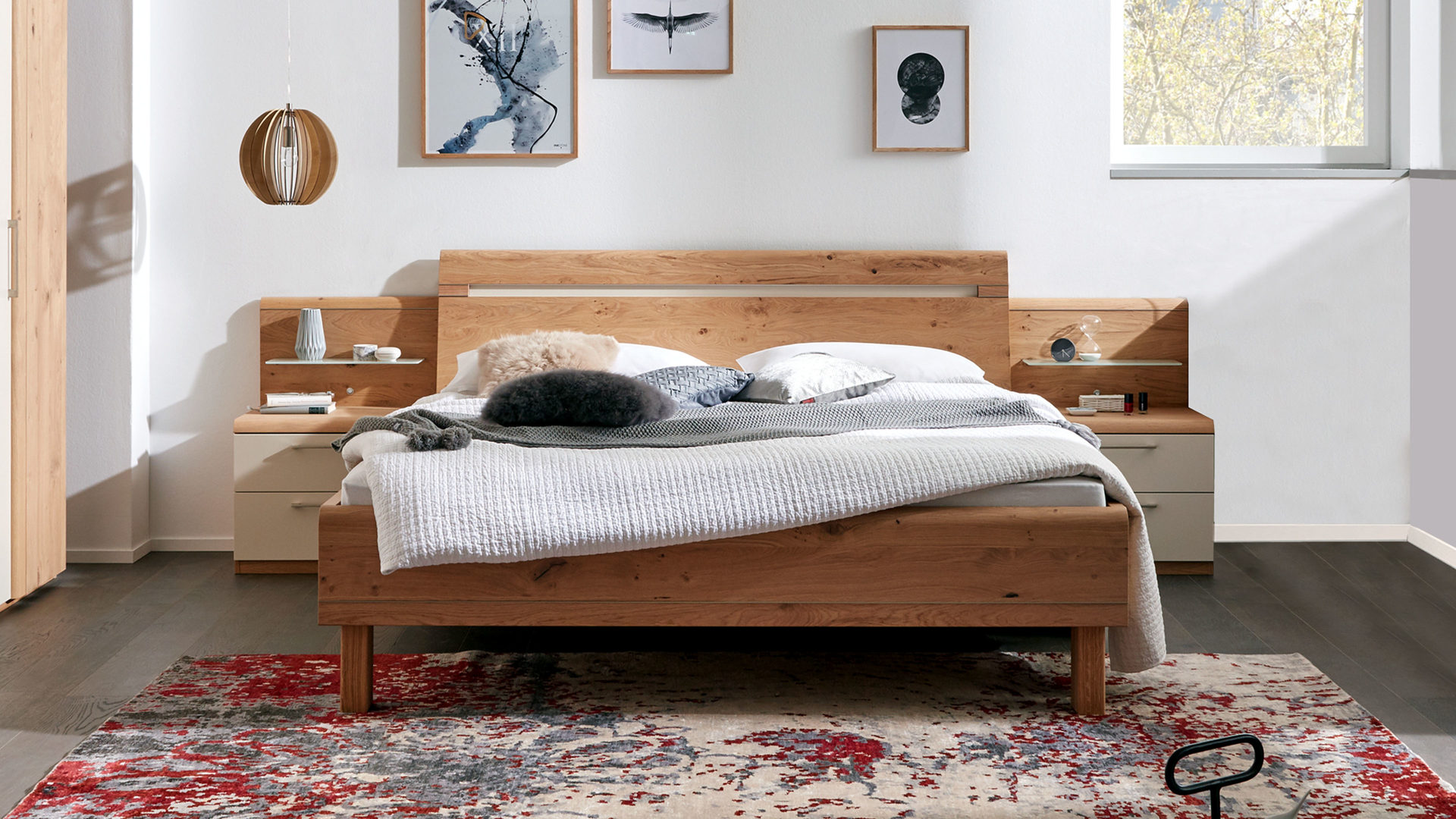 Interliving Schlafzimmer Serie 1008 Bettgestell Mit Nachtkonsolen Taupefarbene Lackoberflachen Balkeneiche Liegefla