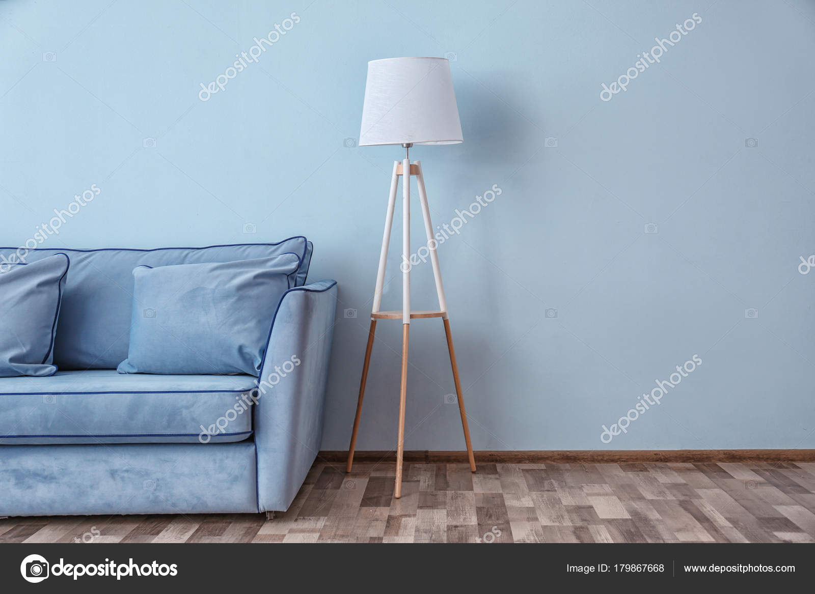 Blaue Couch Und Stehlampe Neben Farbe Wand Stockfoto